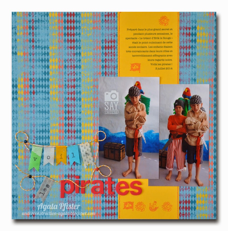 I'm also back to my scrapbooking table, with pleasure, and create again, for example the following layout. My son received those pictures from his teacher as a souvenir of the show they prepared for the end of last school year.